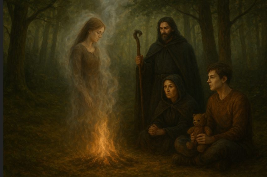 Ogmios knelt first, opening his overcoat and retrieving the arrowhead. It pulsed faintly in his hand, a heartbeat in rhythm with the forest. Badh brought forward a bundle of herbs, sage, heather, sea buckthorn and wild garlic, all harvested from the hills around Mountsandel, each carrying the land’s own memory. Brandon held Paws, the teddy bear, clutched lightly against his chest, a living fragment of his life, his past offered willingly.